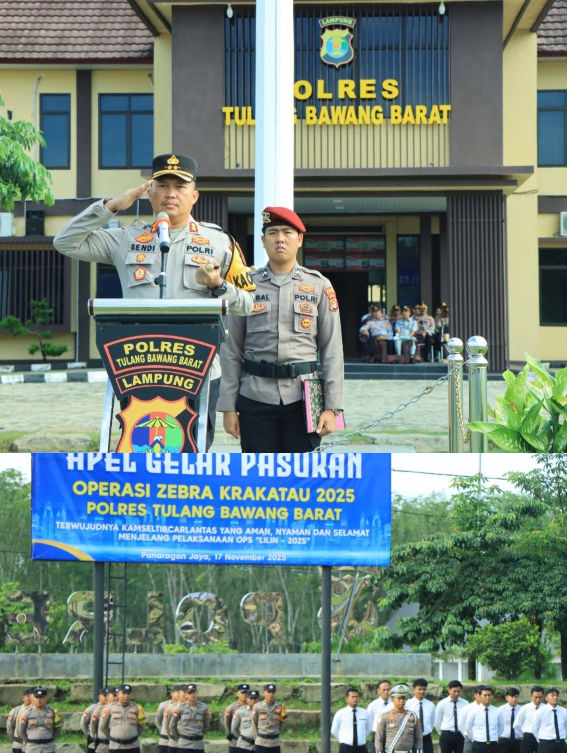 Tulang Bawang Barat, Sinarbangsanews.com – Kapolres Tulang Bawang Barat, Polda Lampung AKBP Sendi Antoni. S. I.K., M.I.K., memimpin langsung apel gelar pasukan dalam rangka Operasi Zebra Krakatau 2025, bertempat di Lapangan Upacara Mapolres Tubaba, Senin (17/11/2025)