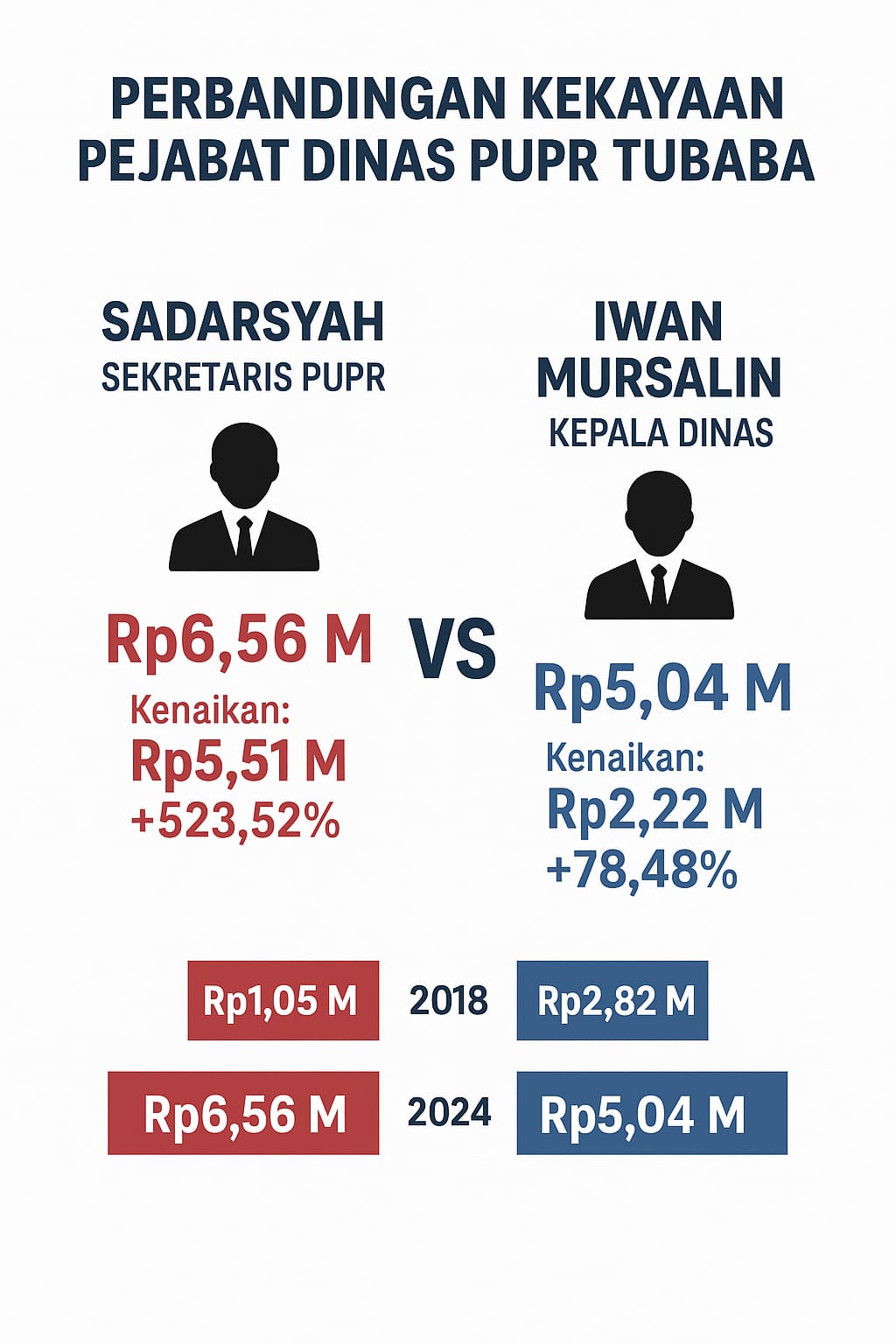Sadarsyah mencatat lonjakan kekayaan yang luar biasa, terutama dari aset tanah, bangunan, dan kendaraan mewah seperti Toyota Fortuner. Sementara itu, Iwan Mursalin yang menduduki jabatan lebih tinggi hanya mengalami kenaikan sekitar Rp2,2 miliar, dengan catatan penurunan kas dan setara kas sebesar Rp 320 juta meski aset tetap bertambah.