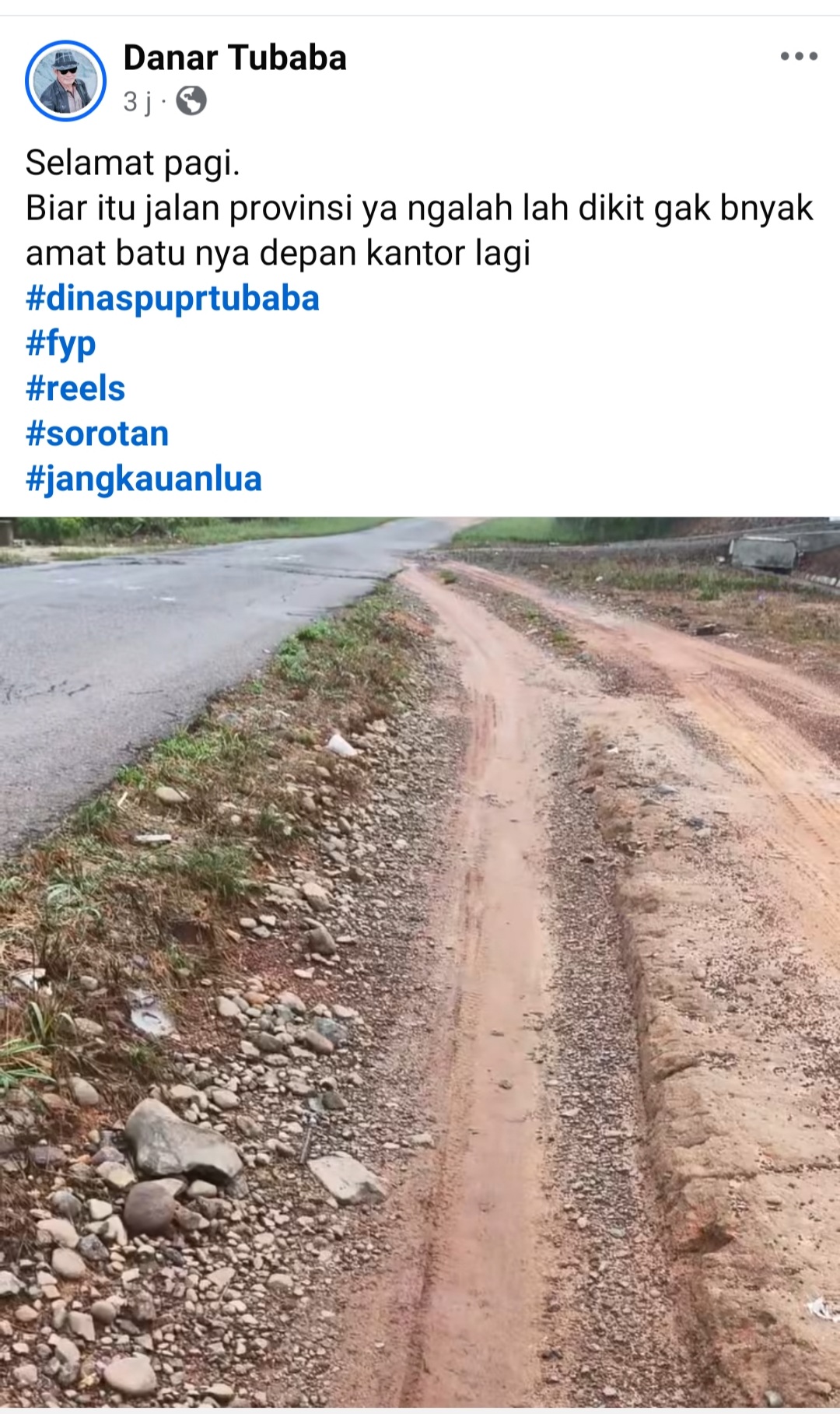 Dalam unggahan tersebut, Danar Tubaba menyampaikan bahwa perbedaan tinggi antara badan jalan beraspal dan bahu jalan tanah di sekitar lokasi tersebut telah menyebabkan sering terjadinya kecelakaan, khususnya bagi pengendara sepeda motor. Ia menyoroti banyaknya batu yang berserakan di sisi jalan dan kondisi permukaan yang tidak rata sehingga sangat membahayakan keselamatan pengguna jalan.