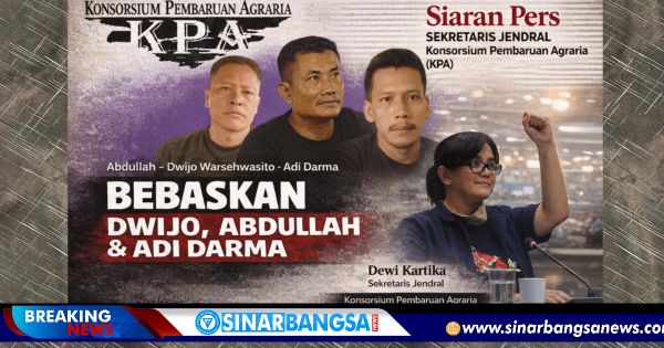 Jakarta, Sinarbangsanews.com – Konsorsium Pembaruan Agraria (KPA) mengecam keras penangkapan lima petani yang tergabung dalam Serikat Tani Aceh (SETIA) yang dilakukan melalui operasi gabungan aparat kepolisian dari Polda Aceh, Polda Lampung, dan Polda Sumatera Selatan. Hingga Senin (6/4/2026), tiga orang petani dilaporkan masih ditahan di Palembang, sementara dua lainnya telah dibebaskan pada dini hari.