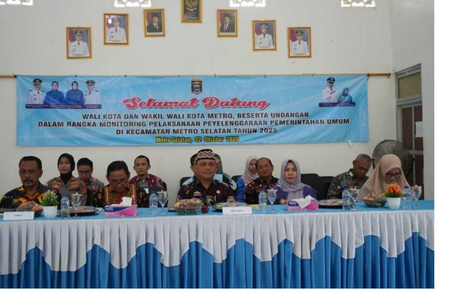 Sinarbangsanews.com, Kota Metro — Wali Kota Metro, H. Bambang Iman Santoso, menghadiri kegiatan Monitoring Pelaksanaan Penyelenggaraan Pemerintahan Umum di Kecamatan dan Kelurahan, yang digelar di Aula Kecamatan Metro Selatan, Kamis (2/10/2025).